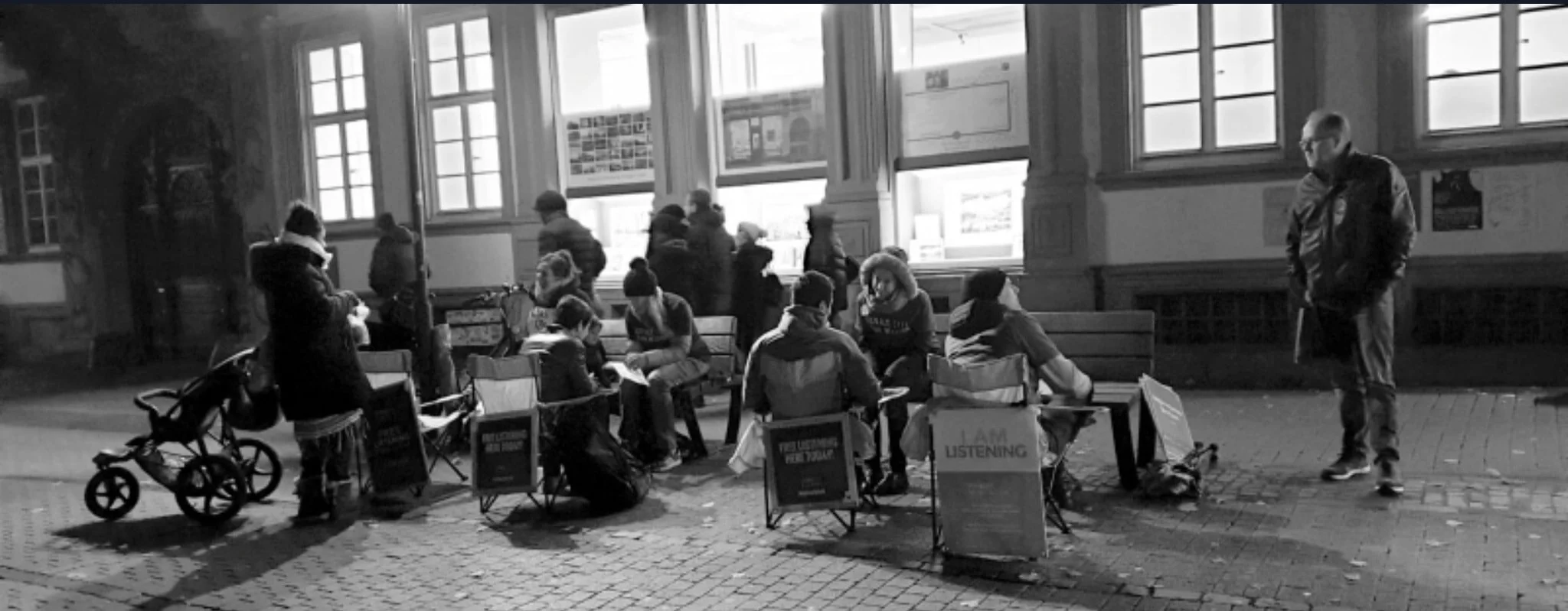 The Heidelberg Sidewalk Talk listeners pulled up chairs in the freezing cold Monday night on an empty stretch of sidewalk and made it warm with connection. What if our communities were places of belonging? What problems could we solve in the world if this was our reality? Pictured are people from all over the world in this very diverse city speaking many different languages.