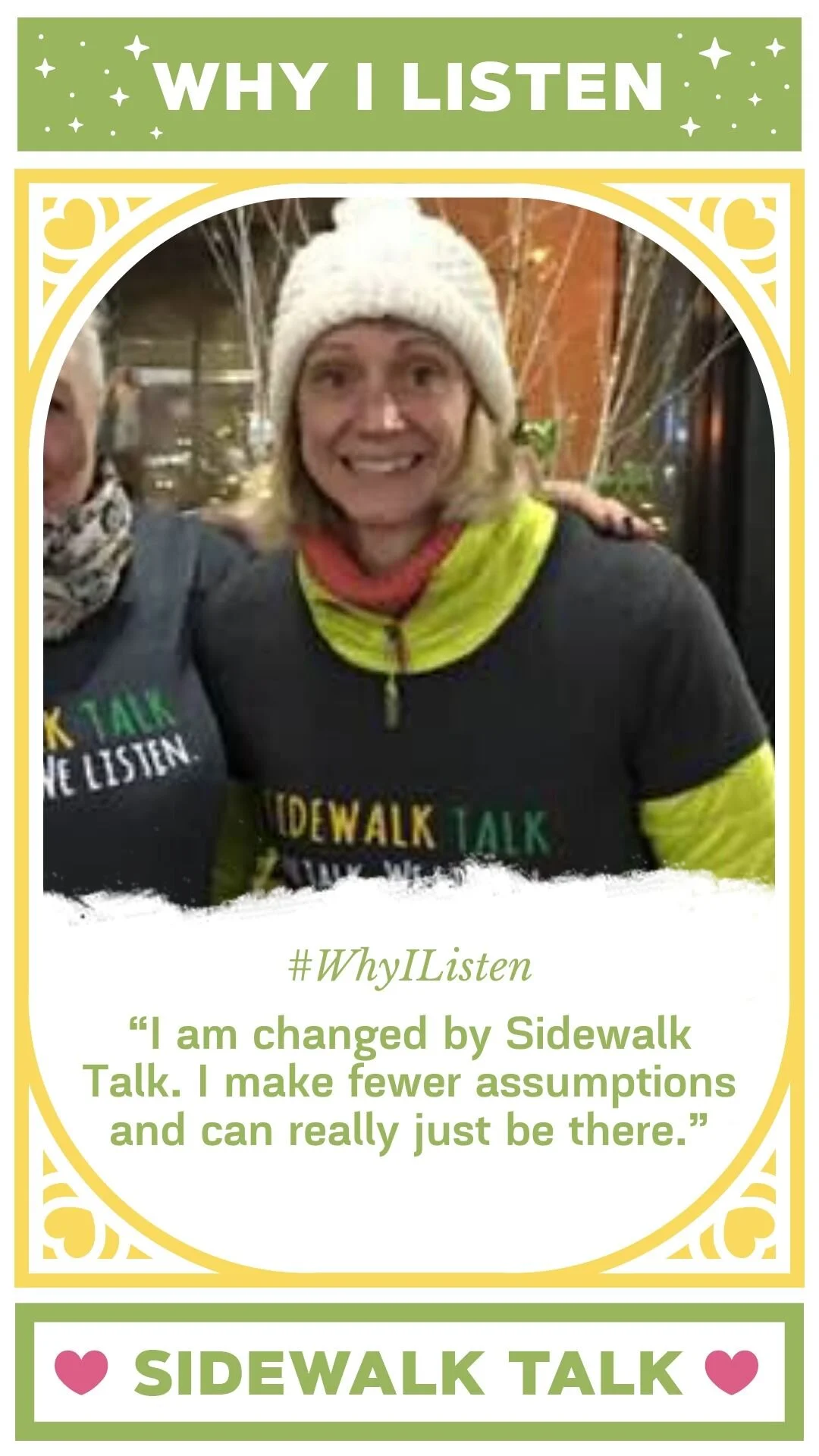 I first volunteered for Sidewalk Talk this year and am now a city leader in San Francisco and head up creative for the organization. I am so surprised how hearing someone’s story makes me less judgemental of others. I am a more loving kind person because of this practice of listening on the sidewalk. I love it. And that kid in me who was lonely, it heals something for him.