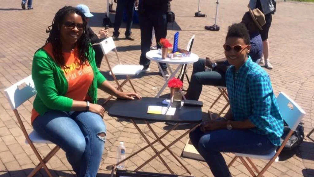 With tables and chairs set outside of the Eastern Market Metro station on a sunny Saturday back in April, three volunteer “listeners” (and special guest, Thomas Knox, from Date While You Wait in New York) heard an array of stories from passersby–from details of day plans to the unfortunate news about diagnoses with chronic illnesses.